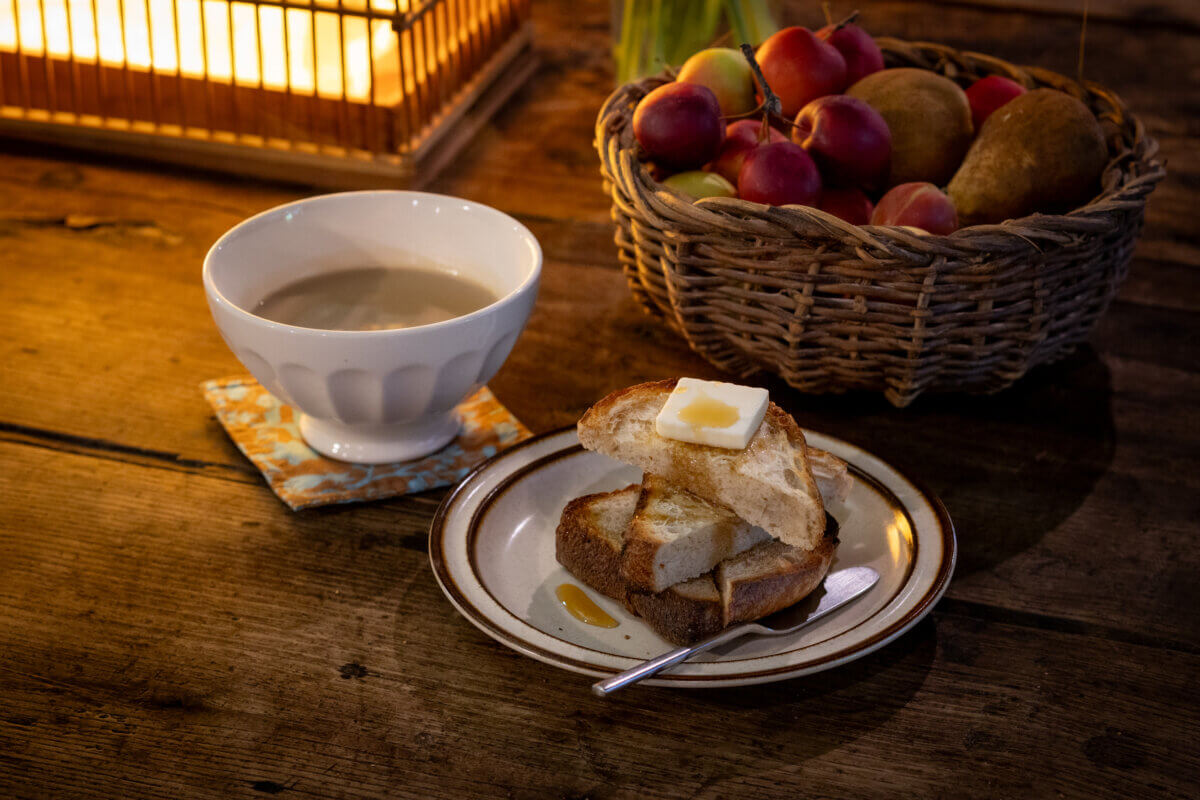 トーストにかかっているのは、オーガニックなメープルシロップ。古民家の雰囲気と相まってゆったり癒される