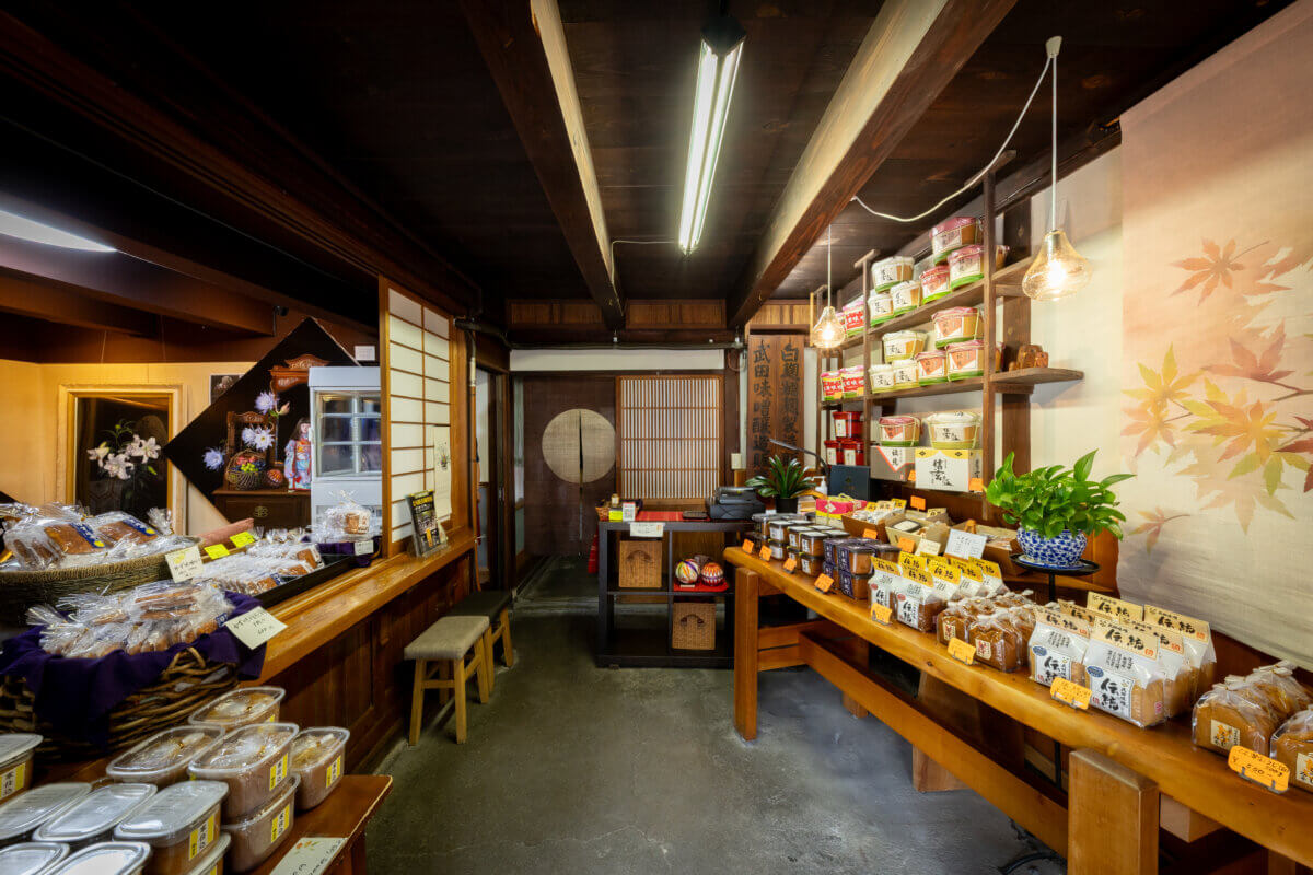 白味噌、赤味噌、半熟仕込み味噌など、全部で24種類ほどの味噌を全国で販売している武田味噌。柳町にある直売所に並ぶ味噌は、そのなかでも選りすぐり、国産原料のお米と大豆のみを使った商品です。
